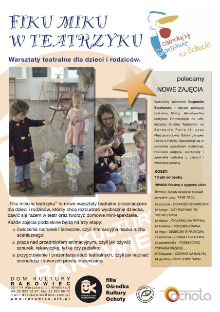 W sobotę 16 marca w Domu Kultury Rakowiec w Warszawie odbędą się warsztaty teatralne z cyklu „Fiku Miku w Teatrzyku”. Zajęcia przeznaczone są dla dzieci i ich rodziców, dla tych, którzy lubią urządzać sobie w domu mini-spektakle i chcą zdobyć nowe pomysły na ten rodzaj zabawy. W tym miesiącu tematem zajęć będzie „Fiku Miku na Patyku”, czyli patyczki będą rekwizytem scenicznym.